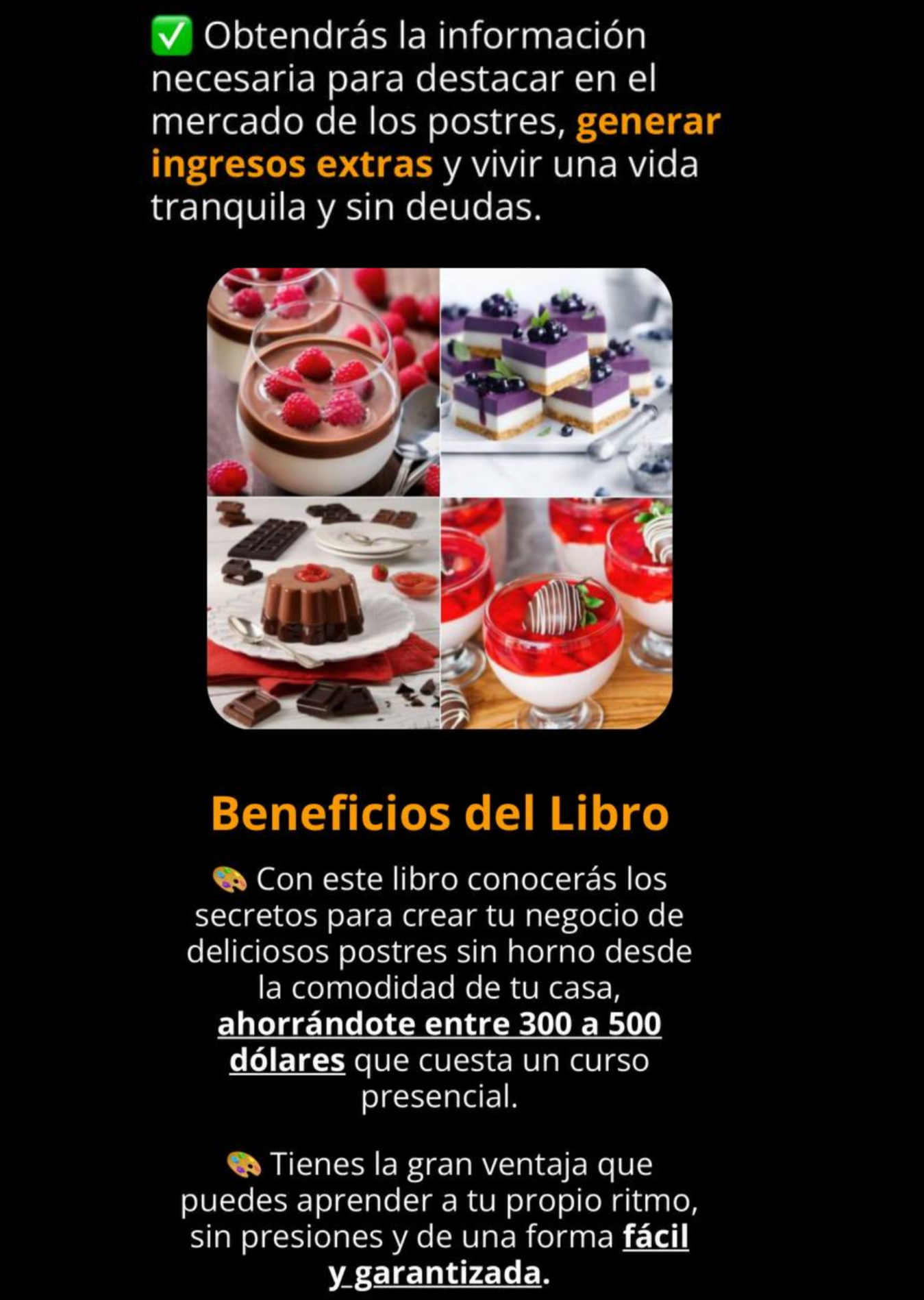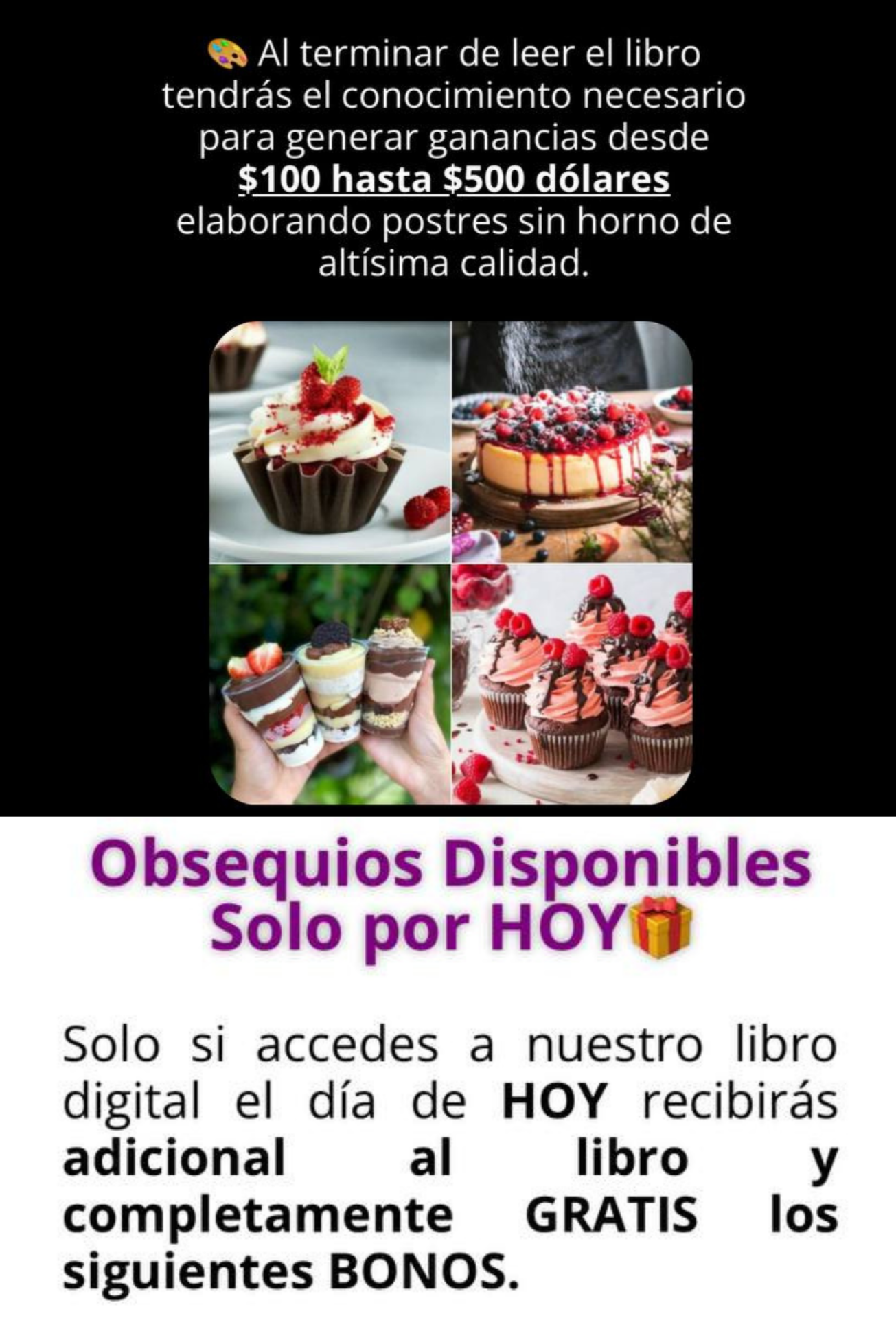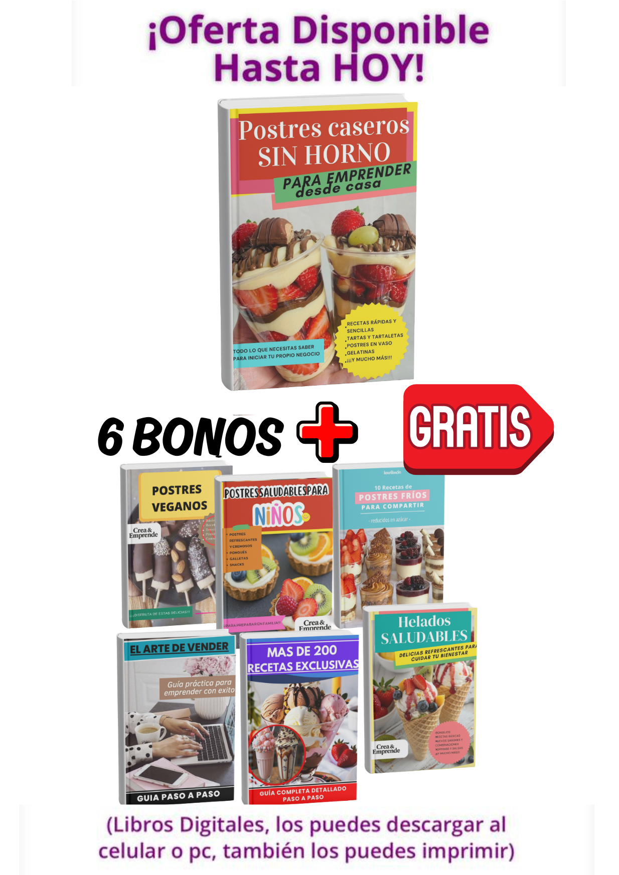 Al realizar la compra inmediatamente recibirás un correo electrónico con el acceso allibro digital POSTRES CASEROS FÁCILES SIN HORNO PARA EMPRENDER + Los 6 Bonos Adicionales